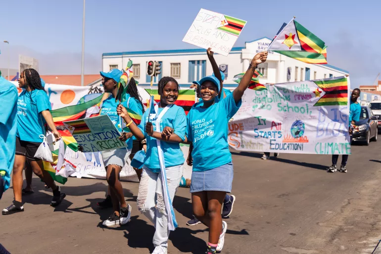 The Presidents of Botswana and Namibia, the Vice-President of Zimbabwe, and the Minister Community Development and Social Services of Zambia have joined more than 100 children to mark this year’s World Children’s Day at a summit in Walvis Bay, Namibia. The summit is a moment for children and their countries’ leaders to discuss solutions to accelerate action to protect and fulfill the rights of every child.